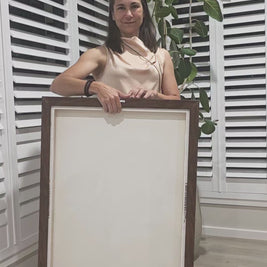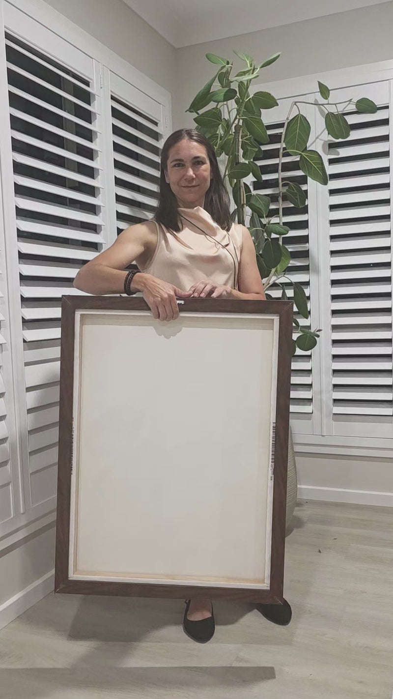 - The framed canvases with brown and black frames have a black inside around the canvas, and the canvases with white frames have a white inside around the canvas.